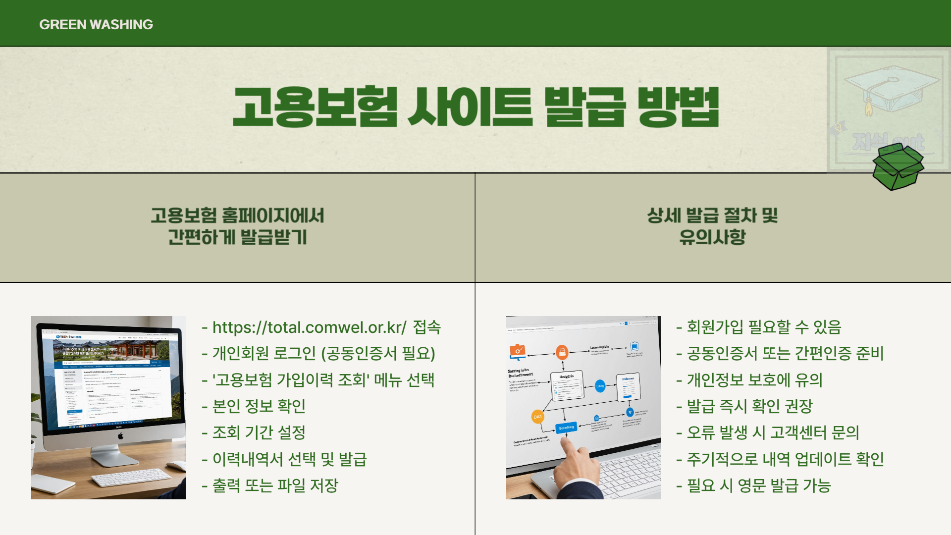 가장 간편한 방법은 고용보험 사이트 에서 발급 받는 거예요. 온라인으로 손쉽게 출력할 수 있어 시간과 비용을 절약할 수 있습니다.