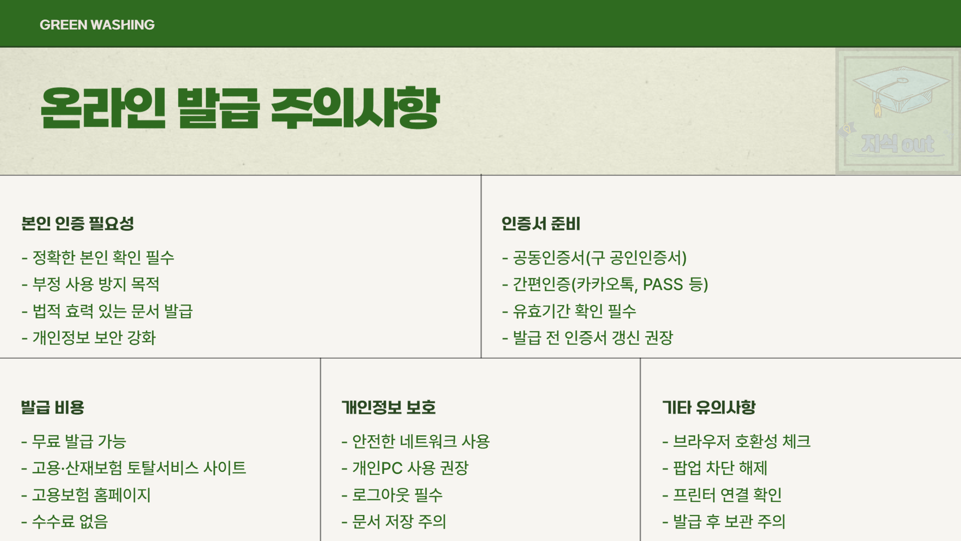 ② 발급 비용 없음: 정부24 및 고용보험 홈페이지에서는 무료로 발급받을 수 있습니다.