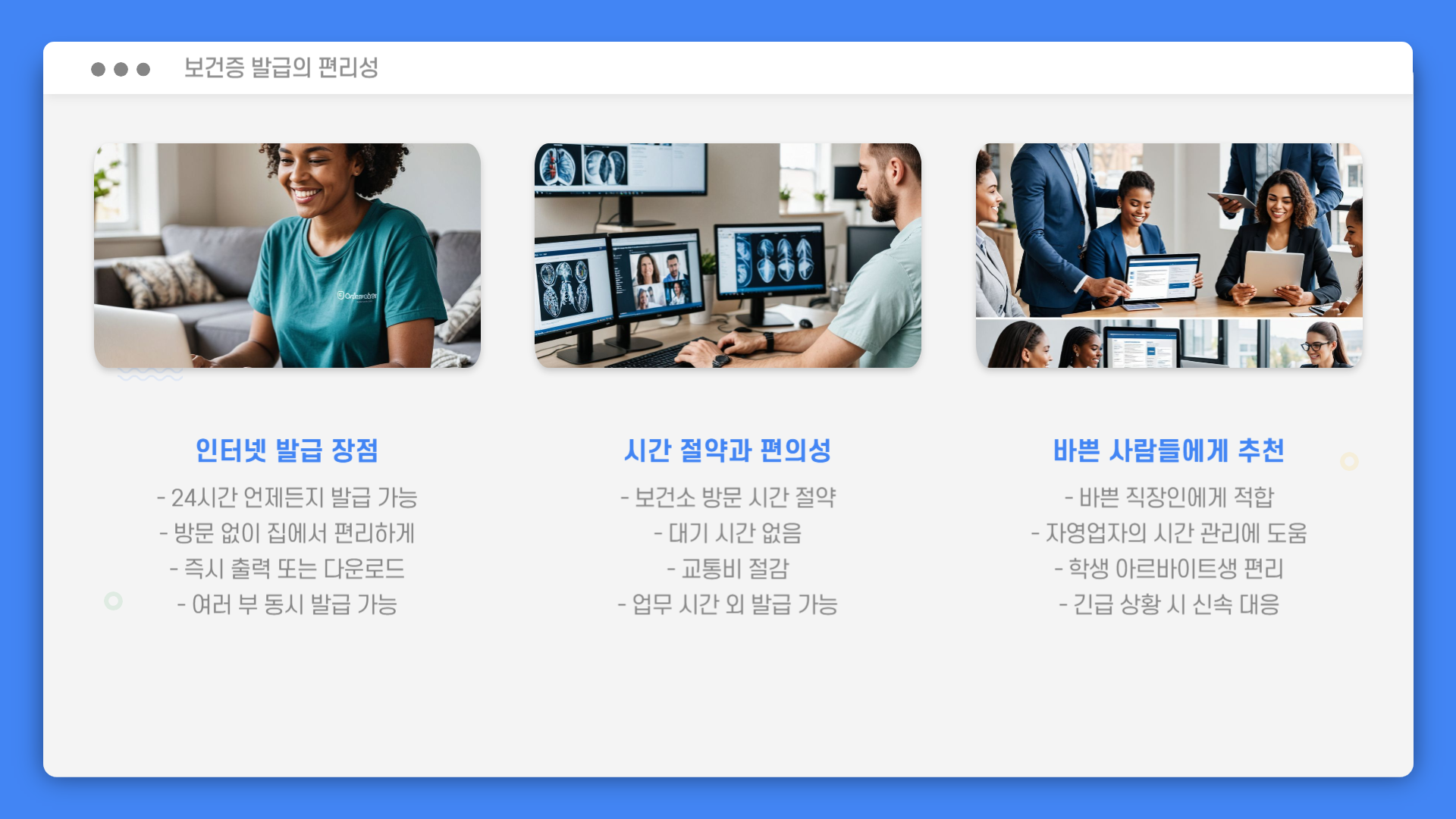 저도 처음에는 보건증 발급이 어렵게만 느껴졌는데, 인터넷 발급을 이용하니 정말 편리했습니다. 방문할 필요 없이 PC나 모바일로 간편하게 발급 가능하니, 바쁜 분들에게도 추천합니다! 😊