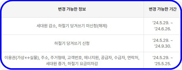 - 세대원 감소기간 : 2024년 5월29일 ~ 2024년 6월26일 (세대원 증가는 사용기간내 상시 가능)