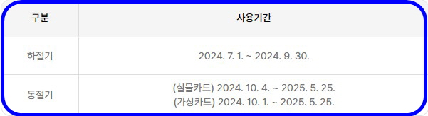 - 동절기 바우처(국민행복카드)는 2024년 10월4일 ~2025년 5월25일 까지 사용간능 합니다. (요금차감은 10월1일부터)