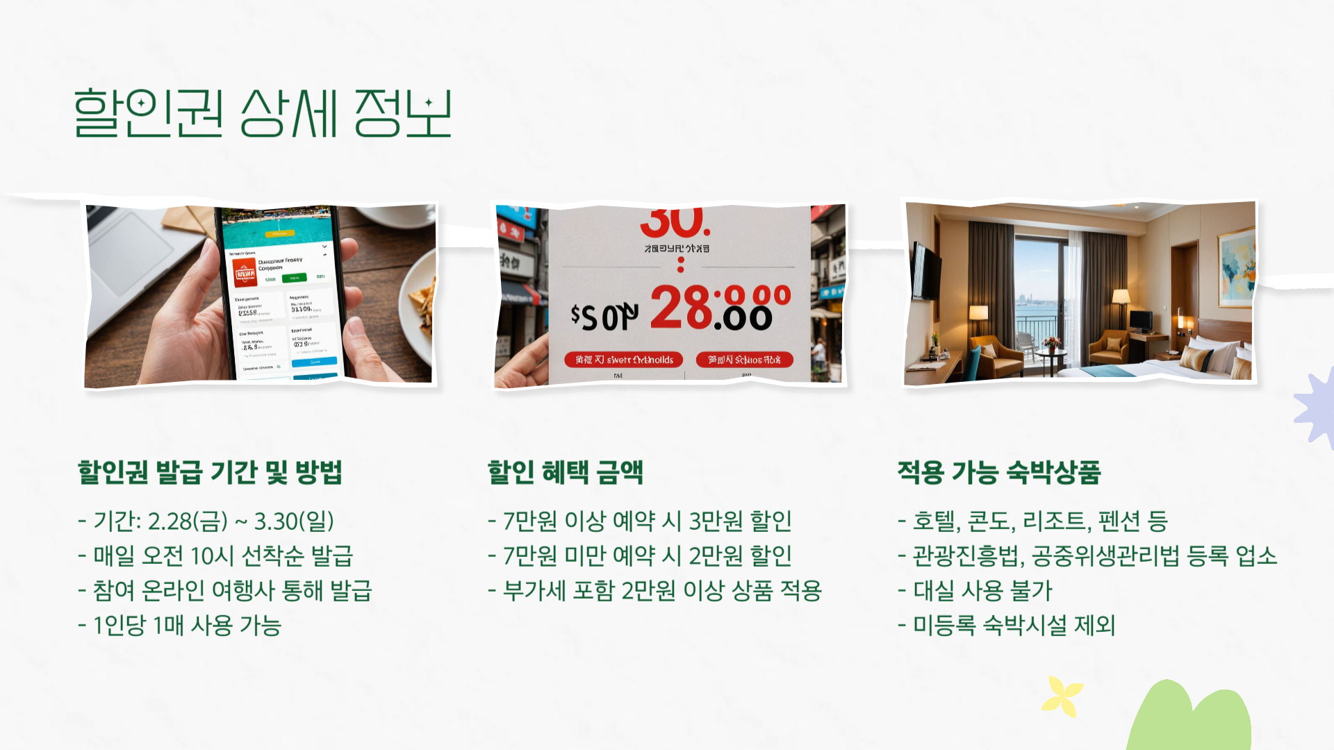 지금 바로 여행 계획을 세우고 할인 혜택을 챙겨보세요! 올봄, 잊지 못할 추억을 만들고 싶은 분들에게 강력 추천합니다. 여러분만의 특별한 여행을 위한 할인권을 꼭 놓치지 마세요! ✈️🌿