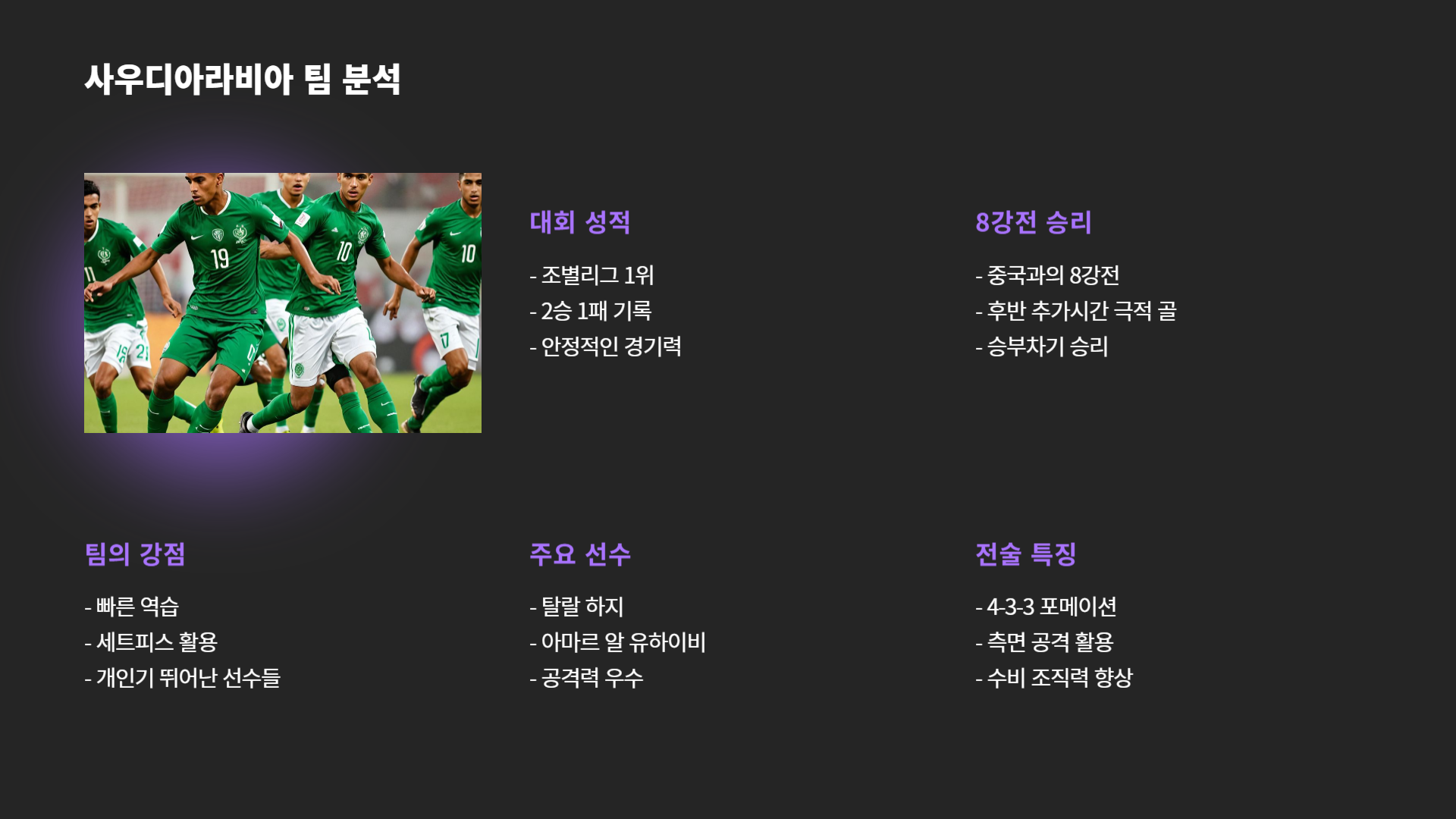 사우디아라비아는 이번 대회에서 2승 1패를 기록하며 조별리그 1위를 차지했고, 8강전에서는 중국을 상대로 후반 추가 시간 극적인 골을 넣으며 승리했습니다.