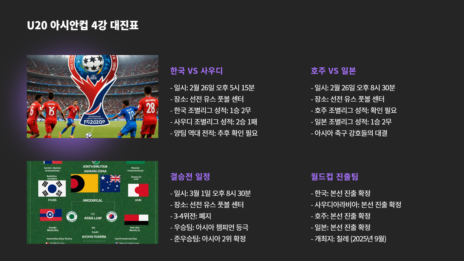 이번 4강전에는 한국, 사우디아라비아, 호주, 일본이 진출했으며, 이 네 팀은 이미 2025 U20 월드컵 본선 티켓을 확보한 상태입니다. 하지만 여기서 멈출 수 없죠. 이제 목표는 우승입니다.